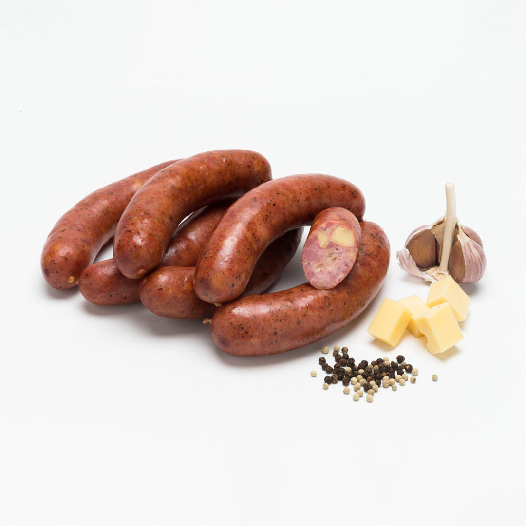 Pork & beef sausage coarsely ground, traditionally seasoned with black pepper, nutmeg and fresh garlic with the addition of chunks of WA Tasty Cheese. Filled into natural casings, cooked and naturally smoked using beech wood.